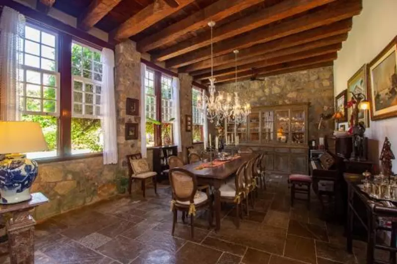 Composta por 3 amplas suítes, armários embutidos em madeira maciça, ar condicionado Split em todos os quartos e suítes, 01quarto, 02 banheiros, 1 lavabo com ducha, 1 banheiro de serviço, sala de estar, sala de leitura, sala de jantar, atelier para costura ou artesanato, varanda com 150m², 1 escritótio, 1 academia de ginástica, ampla cozinha com copa, lavanderia/ garagem, oficina para trabalho e manutenção, área para funcionários, sauna à vapor, piscina, jardim e lareira.