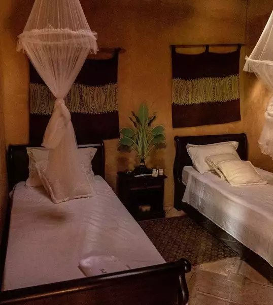 Em primeiro lugar, há uma ampla suíte master, além de outro quarto de casal e mais um quarto com três camas de solteiro, acompanhados de um banheiro compartilhado espaçoso.